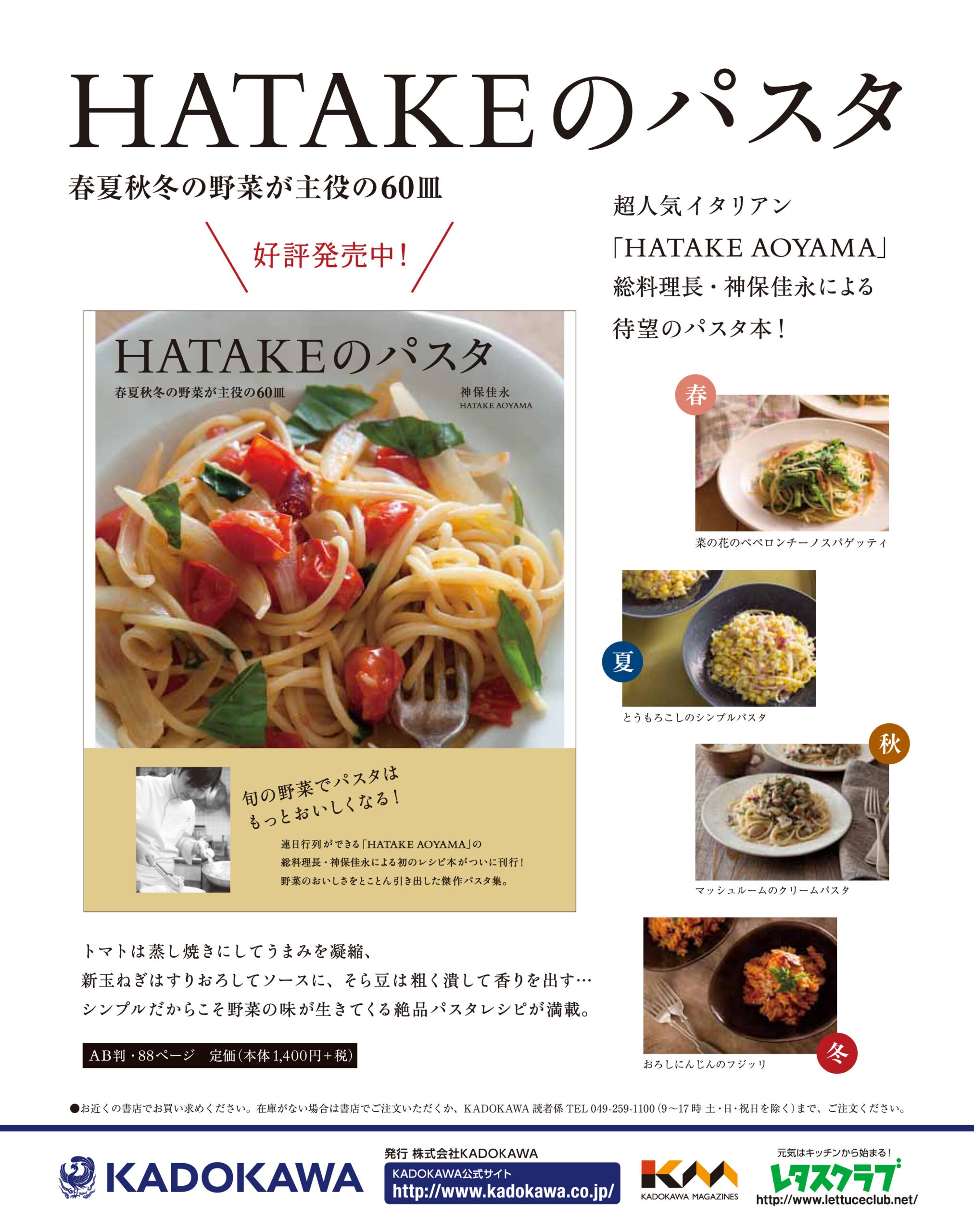 タイトルは自身のレストラン名前を冠に”HATAKEのパスタ”と題し、季節に応じた旬の野菜を調理したパスタのレシピBOOKです。